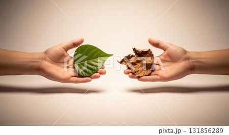 Human hands presenting a fresh green leaf and a dry brown leaf, symbolizing life and decay