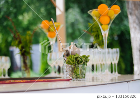 Outdoor bar with fresh mint, bar tools and citrus centerpieces ready for cocktails