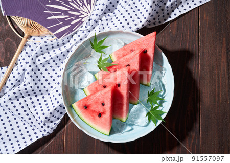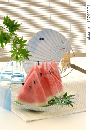 夏イメージ スイカ 風鈴 団扇 青モミジ