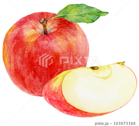 水彩で描いたリンゴのイラスト 葉のついた実 くし形切りのリンゴ