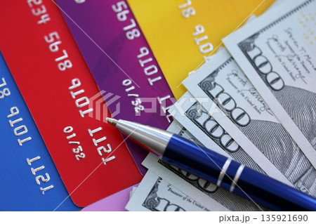 Credit cards and pen with US dollar currency money bills banknotes. Business, financial operations and accounting in United States of America