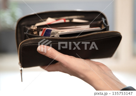 Woman is holding an open black wallet with credit cards and documents inside. Financial management and personal banking concept.