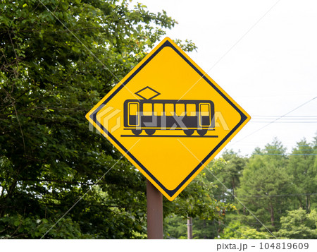道路標識(警戒標識)「踏切あり」。(縦構図)