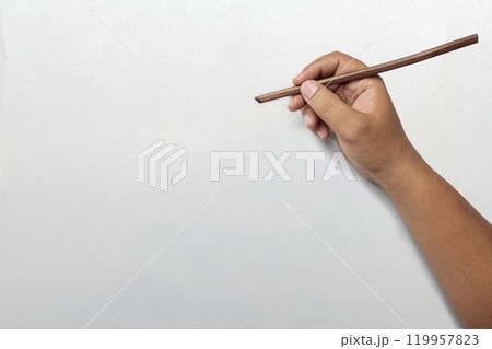 Human hand holding calligraphy reeds isolated over white background