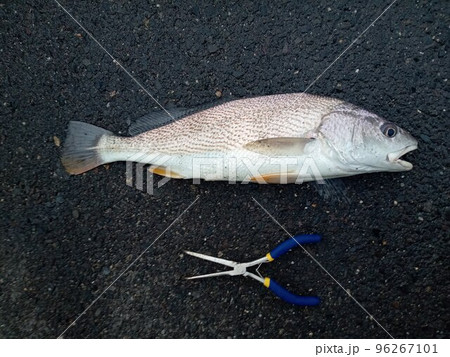 釣れたイシモチ(ニベ・コイチ)を堤防の上で。