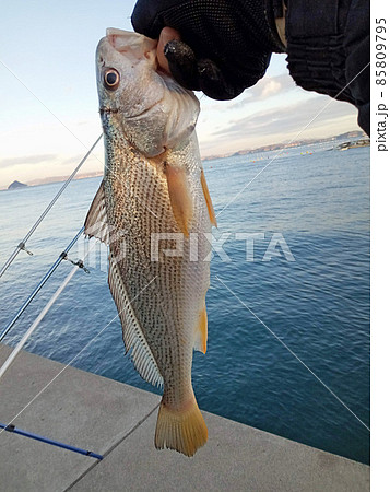 ニベ(コイチ・イシモチ)を堤防でブツ持ち撮影 鬼ヶ島と共に