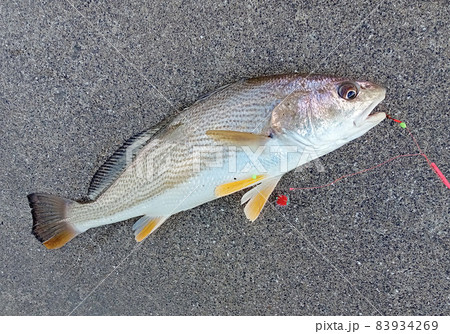 今釣れたニベ(イシモチ・コイチ)をアスファルトの上で撮影