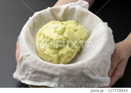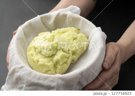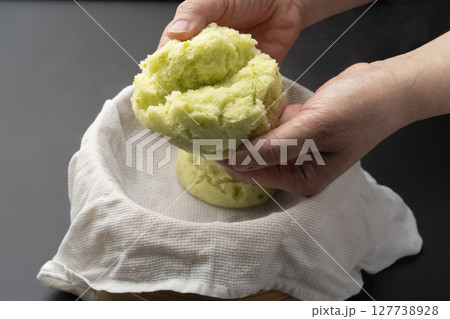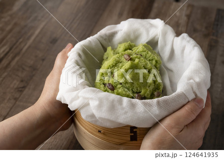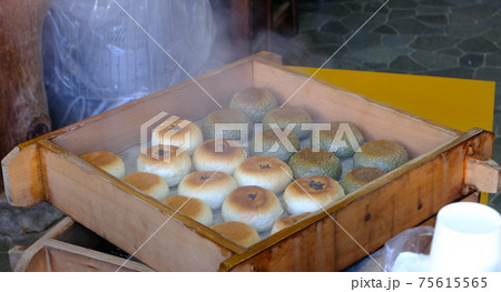 セイロで蒸したよもぎ蒸しパンを手で持つ