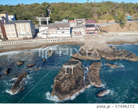 茨城県 大洗海岸 磯前神社の海の鳥居 空撮