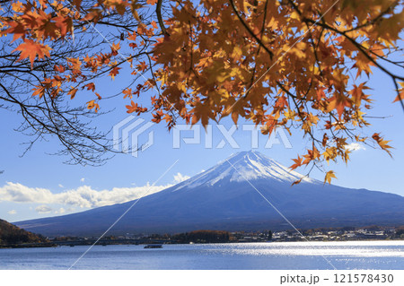 (山梨県)夏の河口湖・水上スキーを楽しむ人と富士山