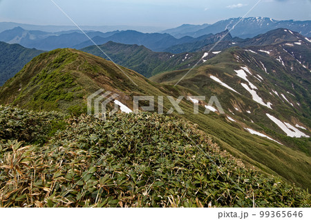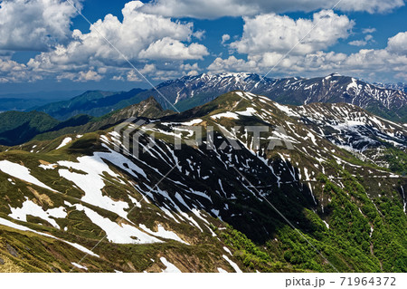 武能岳稜線から見る残雪の上越国境の山並みと巻機山