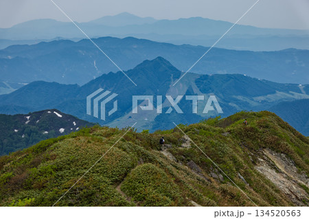 上越国境稜線を行く登山者と武能岳・大源太山・巻機山の眺め