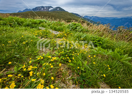 ミヤマキンバイ咲く初夏の蓬峠の登山道