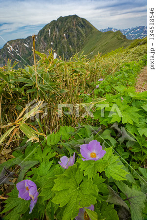 上越国境稜線に咲くシラネアオイと谷川連峰・武能岳