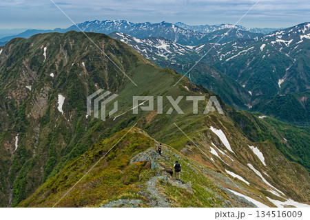 谷川連峰・武能岳へ向かう登山者と残雪の巻機山・越後の山並み