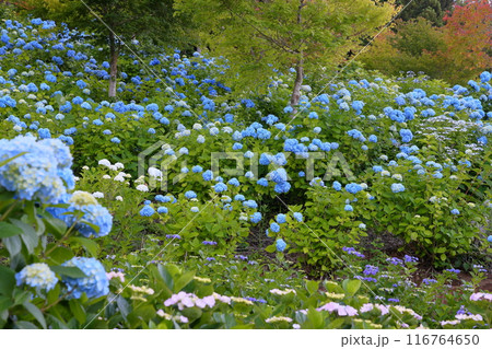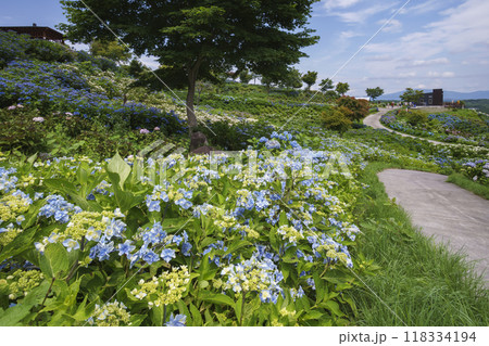 福島県石川郡平田村蓬田新田 蓬田岳麓のジュピアランドひらた近くの青い紫陽花やガクアジサイの群生