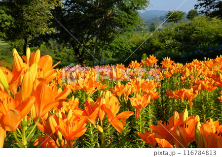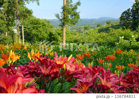 福島県石川郡平田村蓬田新田 蓬田岳麓のジュピアランドひらた 色とりどりの百合が咲くゆり園の景色
