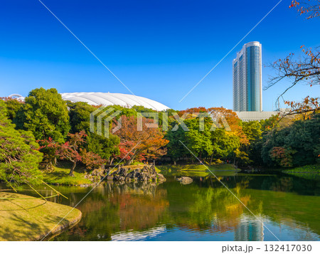 伝統的な日本庭園の紅葉と近代的な高層ビルやドーム球場 (東京都、文京区、小石川後楽園)
