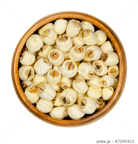 Dried shelled white lotus nuts in wooden bowl. Edible seeds of Indian lotus. Nelumbo nucifera, also known as sacred lotus, bean of India or Egyptian bean, often called water lily. Macro food photo.