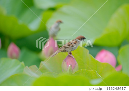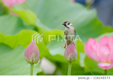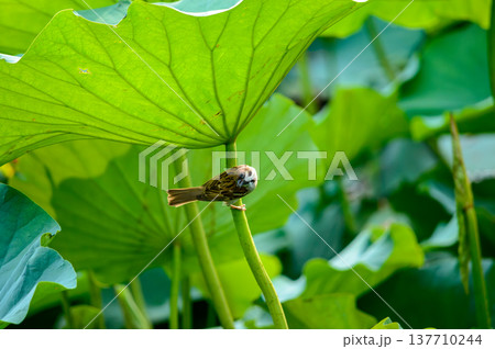 蓮池の雀 蓮の花 すずめ