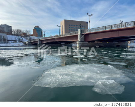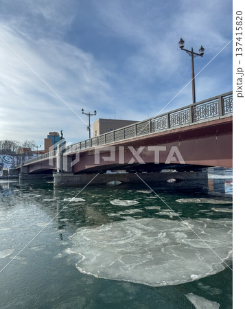 蓮葉氷が浮かぶ釧路川と幣舞橋の冬の青空 2026.1.31 釧路市, 日本
