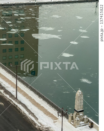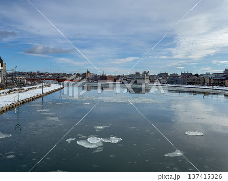 冬の釧路川の水面に映るビルのリフレクションと蓮葉氷 2026.1.31 釧路市, 日本