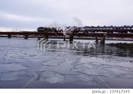 冬の釧路川鉄橋を渡るSL冬の湿原号と薄氷の浮かぶ川面 2026.1.30 北海道釧路市材木町