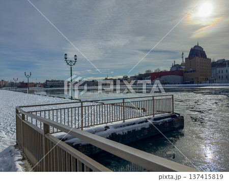陽光に輝く釧路川と対岸に望む幣舞橋・MOOの冬景色 2026.1.31 釧路市, 日本