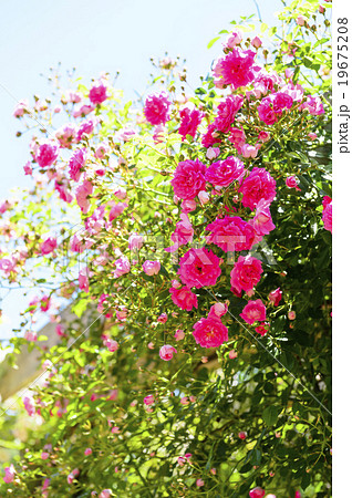 薔薇園の青空に映えるピンクの薔薇の生垣