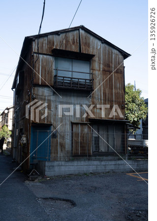 古い昭和建築、トタン作りの錆びた一軒家、鬱蒼とした二階建て狭小住宅