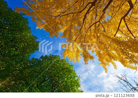 銀杏の木の紅葉と夏みかん