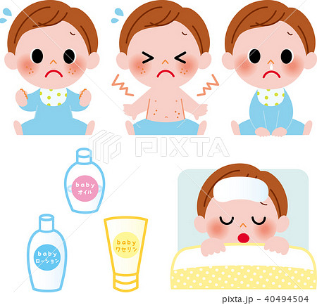 全身に発疹ができて苦しい男の子 手描きイラスト素材