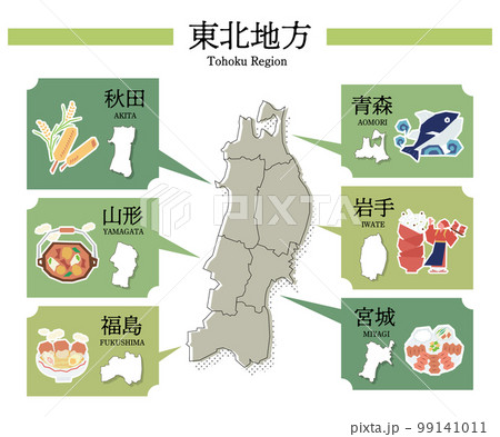 日本の東北地方のグルメ観光とマップ、アイコンのセット