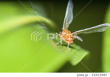 クチナシの葉にとまる害虫「ミドリグンバイウンカ」