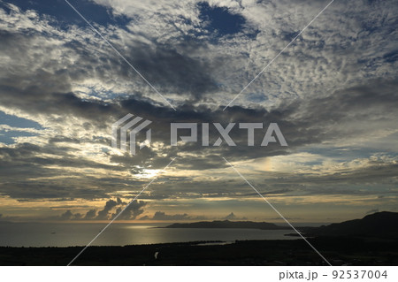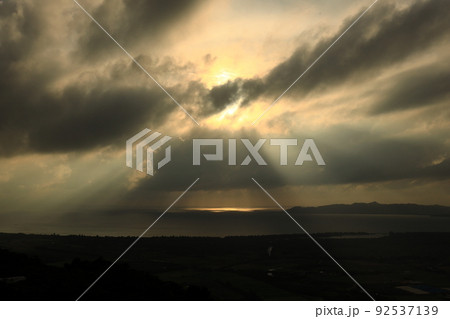 自然 風景 夕暮れ時の石垣島。天使の梯子が出現、陽ざしがあたる海水面も輝きます