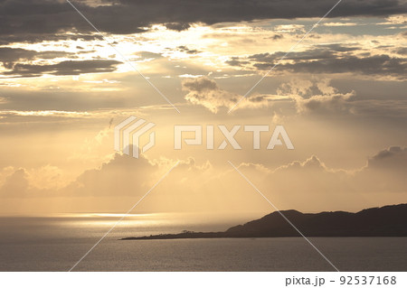 自然 風景 夕暮れ時の石垣島。うっすらと天使の梯子、あたりが金色に包まれます