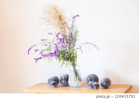花びんに生けたアメジストセージとススキのアレンジメント 秋 冬の花