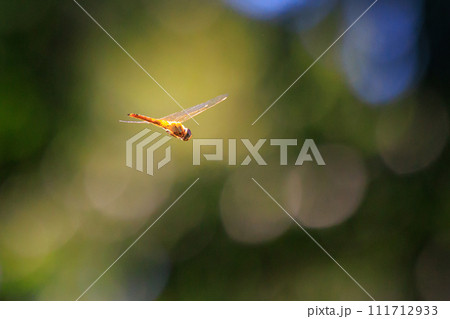 生き物 昆虫 ウスバカゲロウ、林の中をヒラヒラ飛んで明るい木の枝に止まりました。羽の虹色の反射がきれいです
