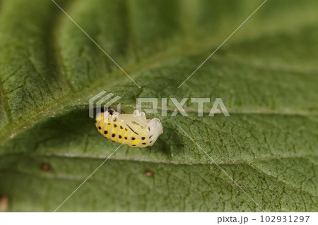 生き物 昆虫 キイロテントウ、蛹です。透明の被り物がおしゃれ、柄も素敵です