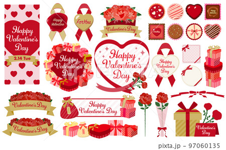 プレゼントやチョコレート・花をあしらったのバレンタインのハートリボンフレーム_ベクターセット素材_赤