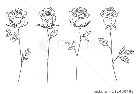 モノクロ線画の薔薇イラスト。モノクロのベクター薔薇イラスト。手描きのシンプル植物画。
