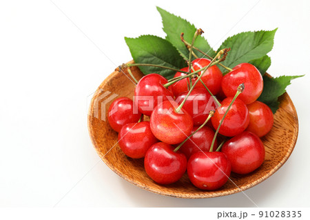 白バックで木の皿に盛りつけたさくらんぼ