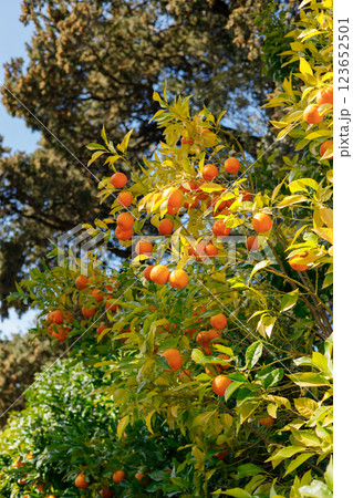 Ripe juicy sweet orange mandarins on a tree in the mandarin orchard. Selective focus. Tangerine sunny garden with green leaves and ripe fruits. Natural outdoor food background