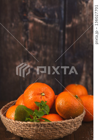 Fresh Tangerines in a Woven Basket Against a Dark Rustic Wooden Background