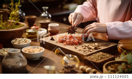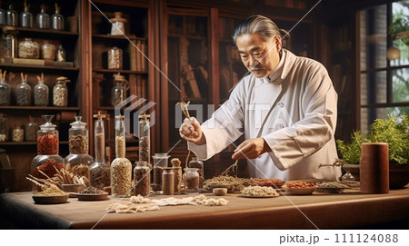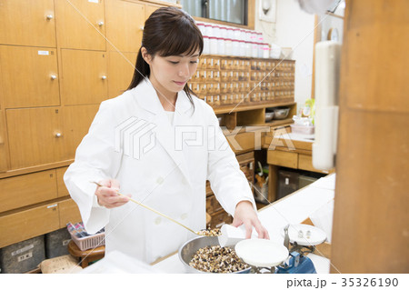 漢方薬を混ぜて調剤するアジアの薬剤師 Asian pharmacist making Chinese
