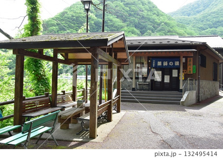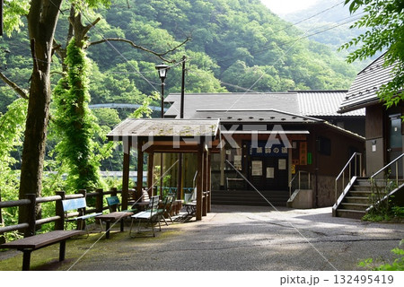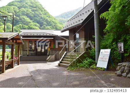 日光市川治温泉 川治ふれあい公園の散策路と薬師の湯案内と新緑