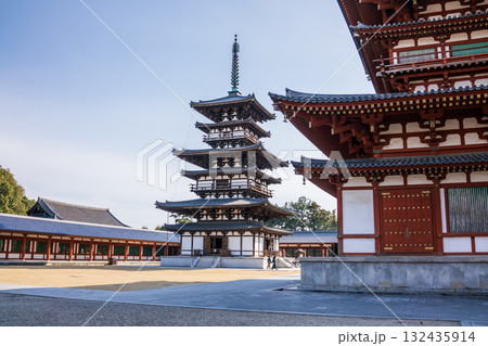 壮大なスケールの奈良薬師寺の風景 西塔・中門・東塔