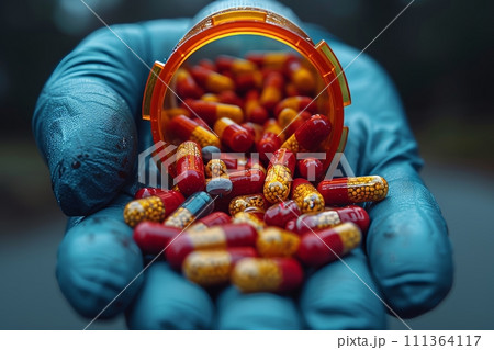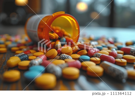 散らばる錠剤: 薬物乱用の社会問題を象徴するイメージ AI生成 18,
