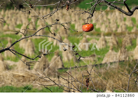 収獲を終えた田んぼの藁ボッチと残し柿