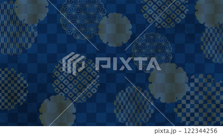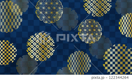 和の背景 紺色の市松文様に金色の雪輪文